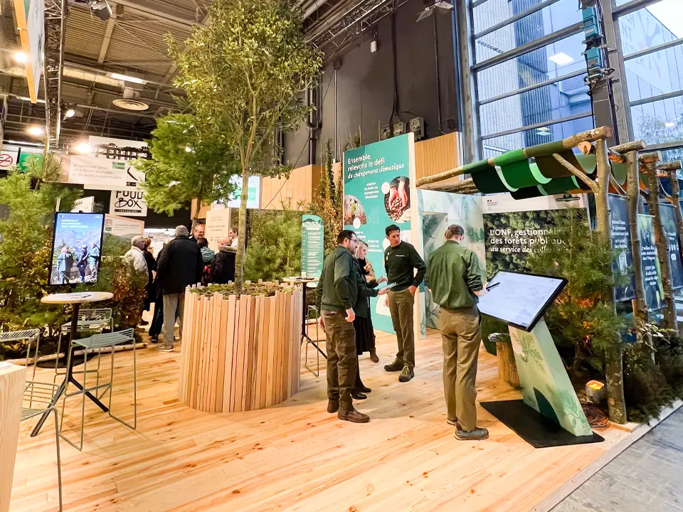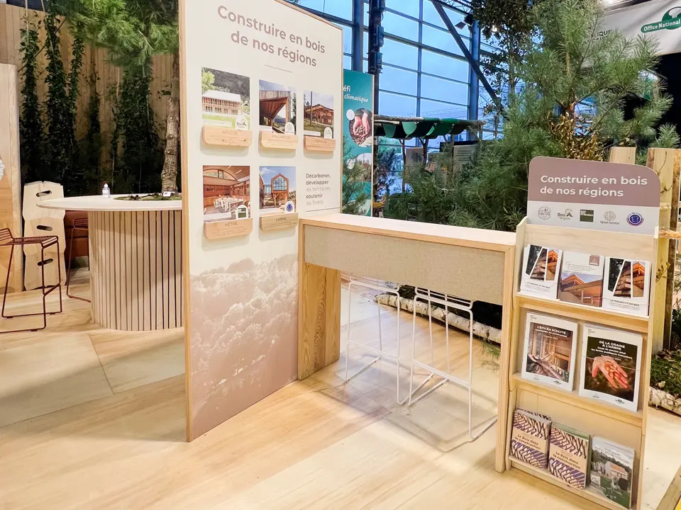 Création d’un stand sur mesure, entièrement conçu en bois français, reflétant les valeurs environnementales de la FNCOFOR