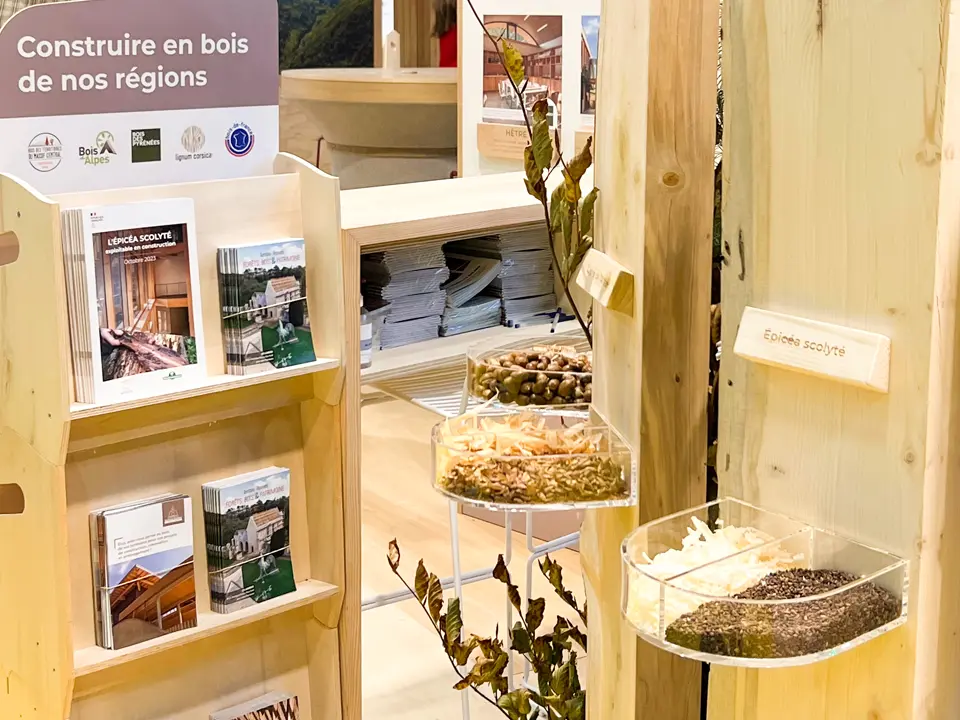 Chaque élément du stand (le parquet, le mobilier, les structures) a été fabriqué à partir de bois français, garantissant une empreinte écologique réduite