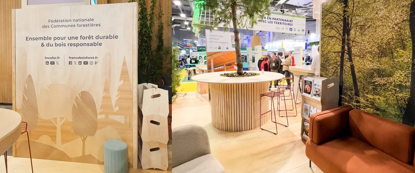 La Fédération nationale des Communes forestières (FNCOFOR) a sollicité notre expertise pour la conception de son stand personnalisé. L’objectif : créer un espace reflétant leur engagement environnemental, en utilisant exclusivement du bois d’origine française.